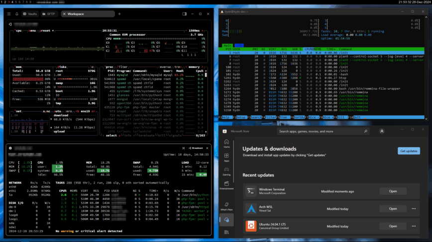To make Windows feel more like my familiar Linux environment, I installed tiling window managers such as Win3WM, Komorebi, and later Workspacer. I used AutoHotkey and custom keybindings to replicate the i3 workflow, and relied heavily on the Windows Subsystem for Linux (WSL) to run Linux command‑line tools. WSL2 allowed me to install Kali, Debian, and Arch distributions and even run GUI apps directly from Windows Terminal. In the Part 2 article, After 10 Years of Linux, I Switched to Windows. Part 2: Still Use Linux via WSL, I described how WSL2 helped me unite Windows and Linux, allowing both environments to run side‑by‑side.