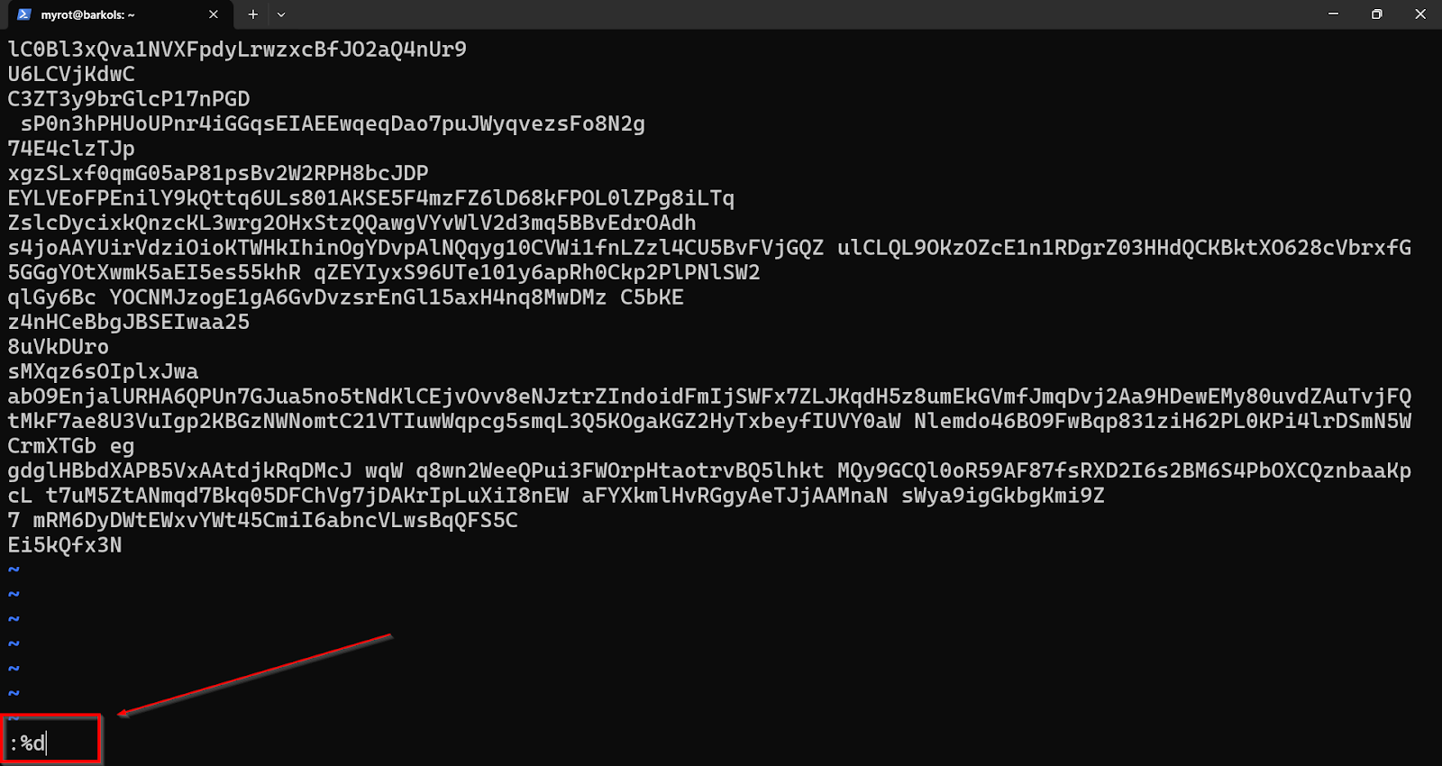 - Enter Command-line Mode and Execute the Command: Now, type a colon (:). You will see the cursor jump to the bottom-left corner of your screen, which indicates that Vim is now in Command-line mode. Next, you need to type %d after the colon and then press the Enter key to confirm and execute the full command. The entire content of the file will be deleted instantly.