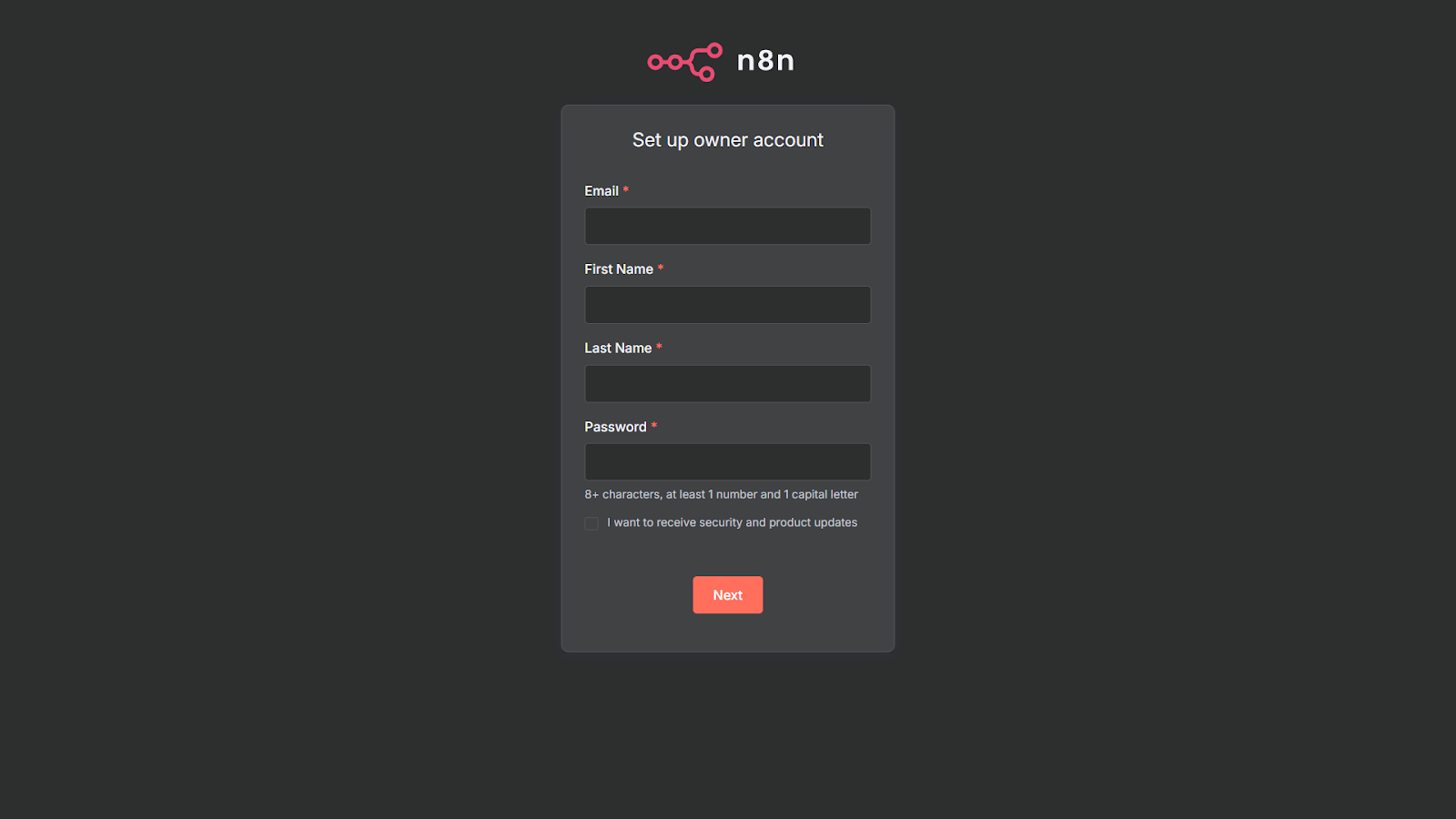 If you use RunCloud’s built-in SSL manager, you will see the following n8n setup screen to create your account: